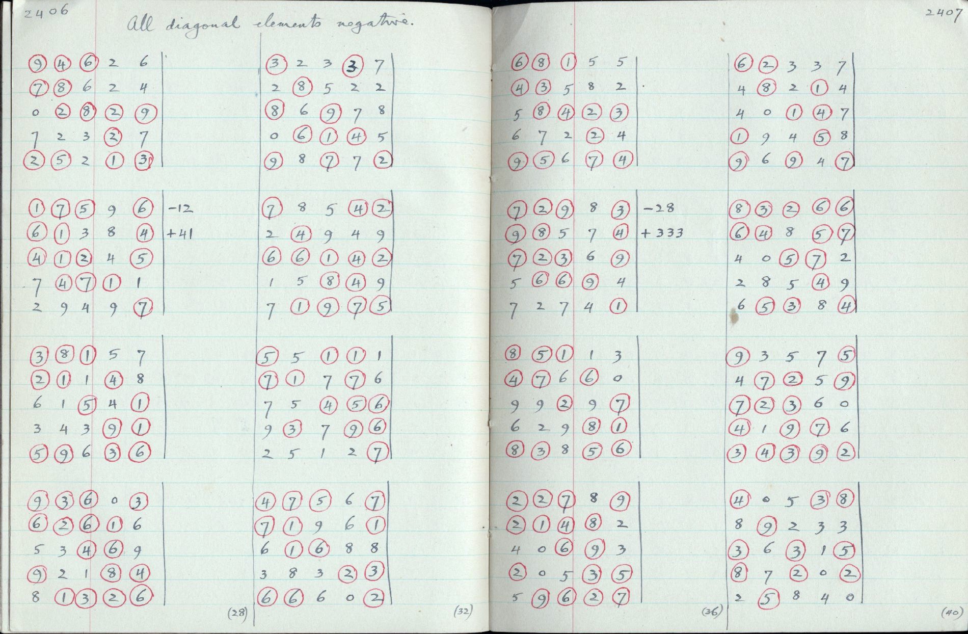 Higher geometry of fields and matrix theory [12]: Lists of numerical matrices suitable for sampling experiments: 5x5 { 2335 2336 2337 2338 2339 2340 2341 2342 2343 2344 2345 2346 2347 2348 2349 }, { 2402 2403 2404 2405 2406 2407 2408 2409 }, 4x4 { 2350 2351 2352 2353 2354 2355 2356 2357 2358 2359 }, { 2380 2381 2382 2383 2384 2385 2386 2387 2388 2389 }, 3x3 { 2368 2369 2370 2371 2372 2373 2374 2375 2376 2377 2378 }, 2x2 { 2362 2363 2364 2365 2366 }